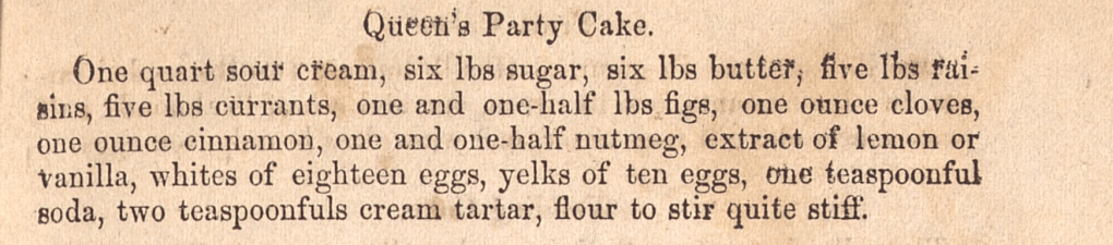 Queen’s Party Cake is rich with butter and sour cream, aromatic with spices, and packed with dried fruit. This is the first of several spiced, fruit filled cakes in the book; perhaps it was Mrs. Russell’s favorite. The quantities in the original recipe will serve a very large party indeed, and would have been baked as small cakes, allowing for an elegant hand-held treat. Because the original recipe yields more cakes than would be needed for most occasions, the recipe has been reduced to one-eighth quantity. We suspect that the typesetter made an error setting Mrs. Russell’s copy, and that the recipe should include larger quantities of cream of tartar and baking soda.